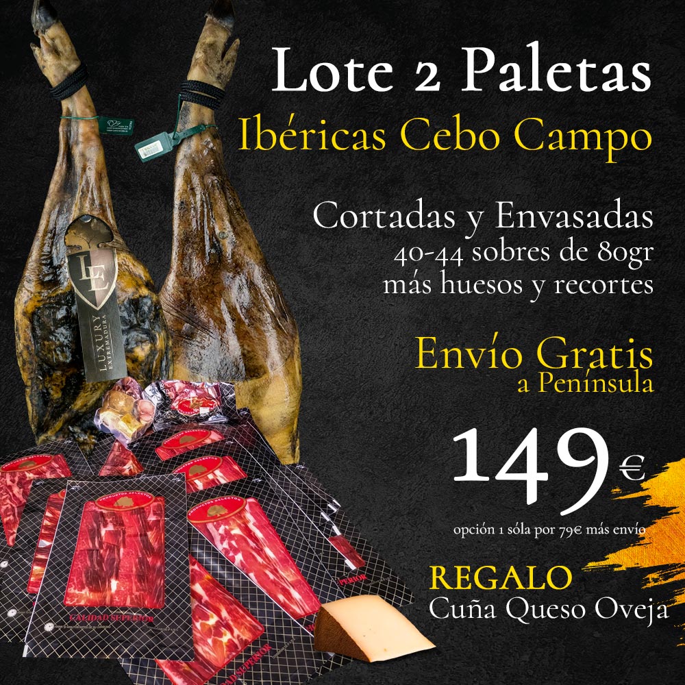 Lote compuesto de 2 Paletas Ibéricas de Cebo Campo de alta calidad cortadas y envasadas al vacío. ¡REGALO! Cuña de Queso de Oveja GRATIS